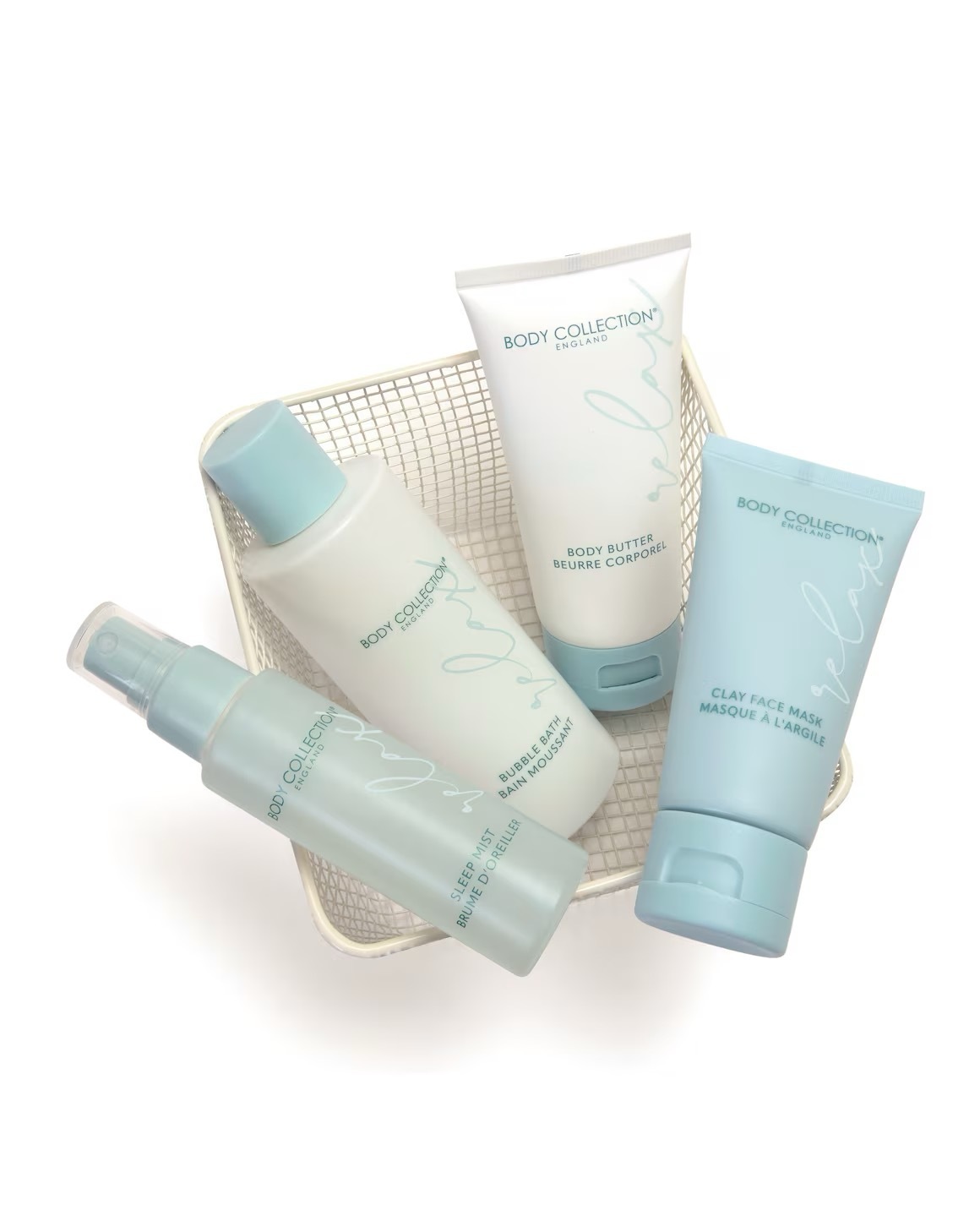 Featuring a reusable wire basket filled with all you need to create the spa experience at home, including a clay face mask and body butter, plus a bubble bath & sleep mist, both infused with relaxing lavender extract.